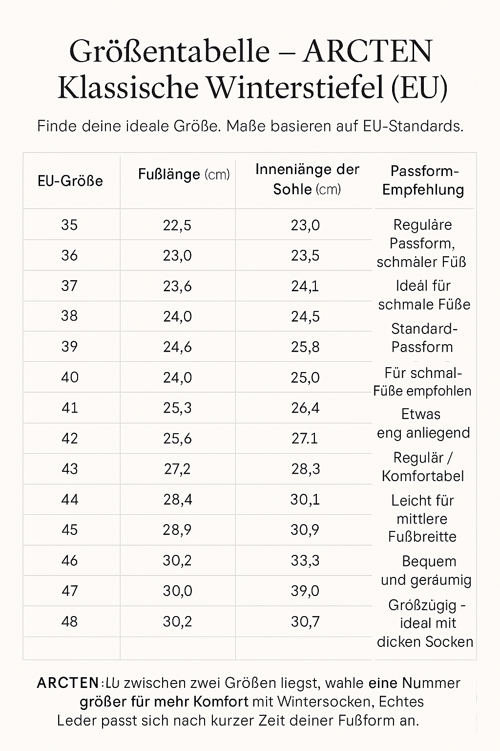 Die ARCTEN-Stiefel sind der perfekte Mix aus Stil und Funktion. Ich bekomme ständig Komplimente dafür. Warm, wasserdicht und super leicht zu kombinieren.